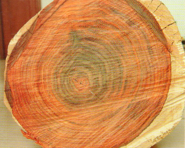 心邊材區(qū)別明顯,心材新切面紫紅褐或暗紅褐.常帶黑褐或栗褐色深條紋(俗稱黑筋).非常漂亮;邊材灰白色。生長輪不明顯或略明顯。