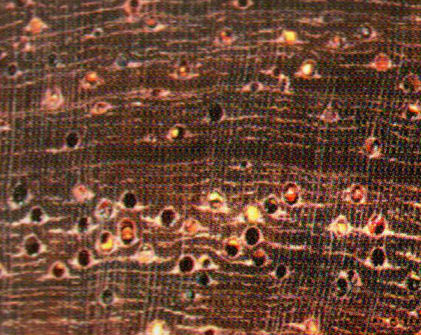 散孔材。管孔肉眼下略見,甚少至略少,大小中等;主為單管孔。少數(shù)徑列復管孔(2-3個);富含黑褐色樹膠,部分管孔內(nèi)可見金黃色的沉積物。類似檀香紫檀的金星,軸向薄壁組織放大鏡下明顯,主為不規(guī)則斷續(xù)細線狀,還有部分翼狀和環(huán)管狀。木射線放大鏡下可見,密至甚密,甚窄。波痕明顯。