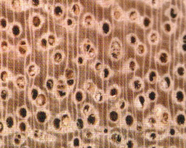 散孔材。管孔肉眼下明顯少而略大;主為單管孔,少數(shù)徑列復管孔(2~3個);含淺色臘質沉積物和褐色樹膠。軸向薄壁組織肉眼下可見,發(fā)達,環(huán)管狀、翼狀,聚翼狀及輪界狀。木射線放大鏡下明顯,密度中。窄。