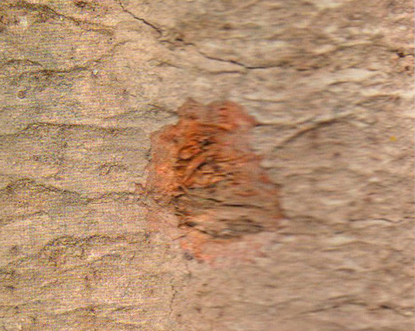 厚0.5 ~ 1.5 cm。外皮灰白至灰褐色,較薄。堅硬,易小片狀脫落而殘留淺凹坑,密布卵圓形皮孔。內(nèi)皮新鮮時黃白色,久則成橘黃色。韌皮纖維略發(fā)達,石細胞發(fā)達,顆粒狀至層狀。分布均勻。