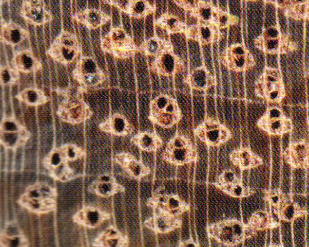 散孔材。管孔肉眼下明顯,少,略大;主為單管孔,少數(shù)經(jīng)列或斜列復管孔(2~3個);具黑色樹膠及硫黃色沉積物。軸向薄壁組織肉眼下明顯,發(fā)達,翼狀、聚翼狀及輪界狀。木射線放大鏡下明顯,密度中,甚窄。